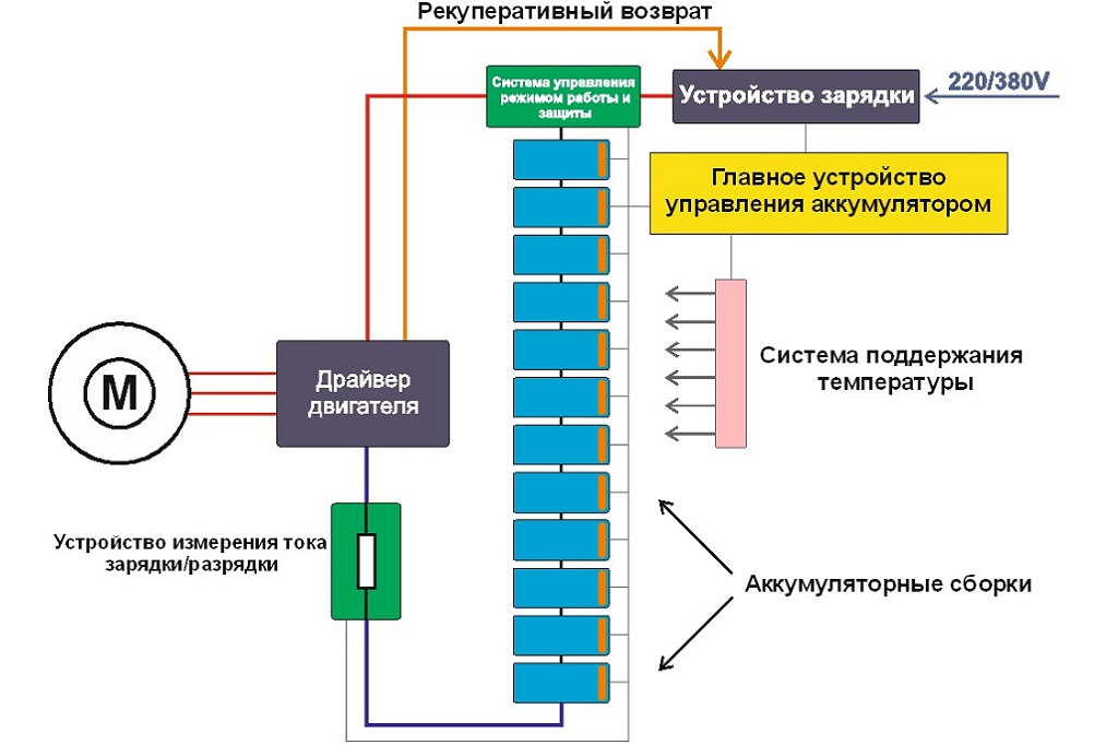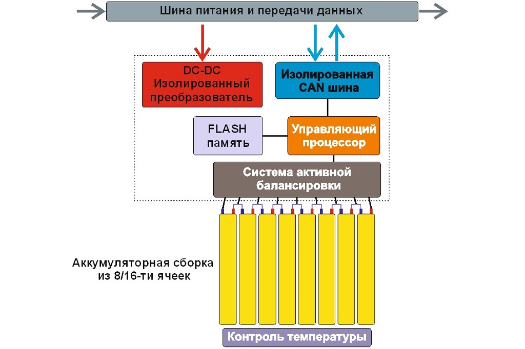 Система контроля и управления (СКУ), осуществляющеая балансировку единичных аккумуляторов, мониторинг состояния батареи и коммуникацию с головным устройством автомобиля.